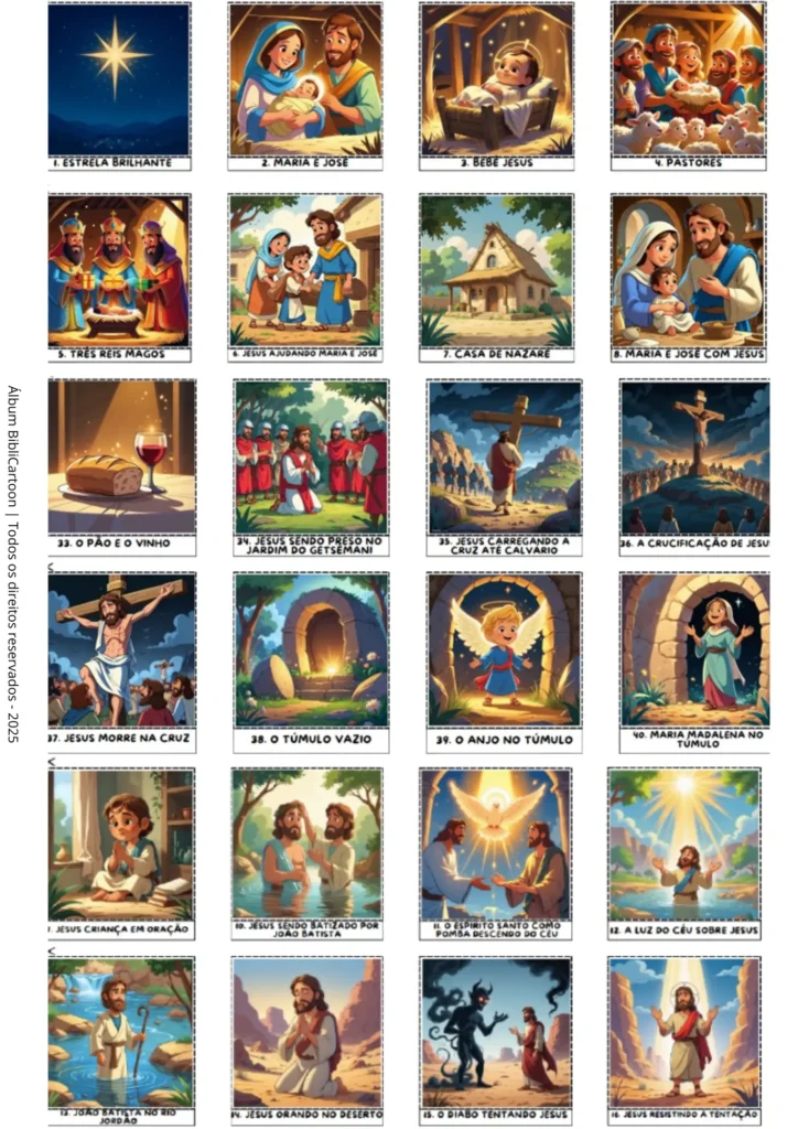 Ao completar o álbum, seu filho terá conhecido toda a trajetória de Jesus de forma leve, visual e inesquecível. Uma experiência que une fé, diversão e memórias preciosas em família.